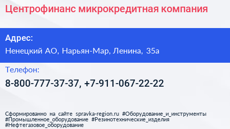 Центрофинанс, микрокредитная компания по адресу Ненецкий АО, Нарьян-Мар, Ленина, 35а в дальнейшем Организация, размещена в следующих категориях: