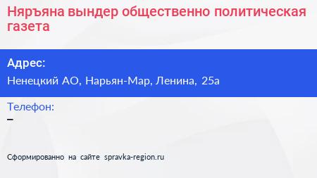 Няръяна вындер, общественно-политическая газета по адресу Ненецкий АО, Нарьян-Мар, Ленина, 25а в дальнейшем Организация, размещена в следующих категориях: