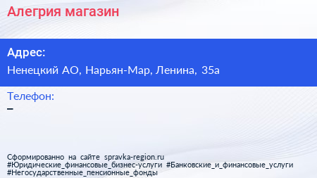 Алегрия, магазин по адресу Ненецкий АО, Нарьян-Мар, Ленина, 35а в дальнейшем Организация, размещена в следующих категориях: