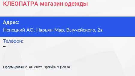 КЛЕОПАТРА, магазин одежды по адресу Ненецкий АО, Нарьян-Мар, Выучейского, 2а в дальнейшем Организация, размещена в следующих категориях: