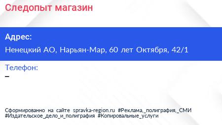 Следопыт, магазин по адресу Ненецкий АО, Нарьян-Мар, 60 лет Октября, 42/1 в дальнейшем Организация, размещена в следующих категориях: