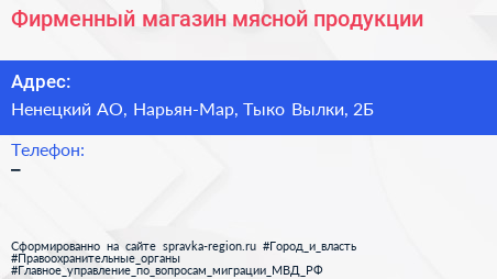 Фирменный магазин мясной продукции по адресу Ненецкий АО, Нарьян-Мар, Тыко Вылки, 2Б в дальнейшем Организация, размещена в следующих категориях: