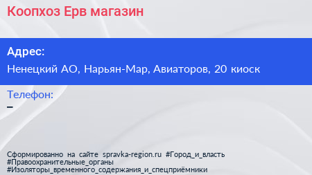 Коопхоз Ерв, магазин по адресу Ненецкий АО, Нарьян-Мар, Авиаторов, 20 киоск в дальнейшем Организация, размещена в следующих категориях: