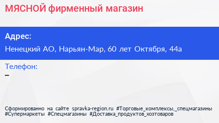 МЯСНОЙ, фирменный магазин по адресу Ненецкий АО, Нарьян-Мар, 60 лет Октября, 44а в дальнейшем Организация, размещена в следующих категориях: