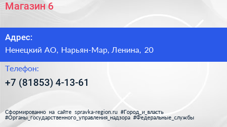 Магазин №6 по адресу Ненецкий АО, Нарьян-Мар, Ленина, 20 в дальнейшем Организация, размещена в следующих категориях:
