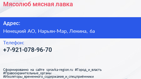 Мясолюб, мясная лавка по адресу Ненецкий АО, Нарьян-Мар, Ленина, 6а в дальнейшем Организация, размещена в следующих категориях: