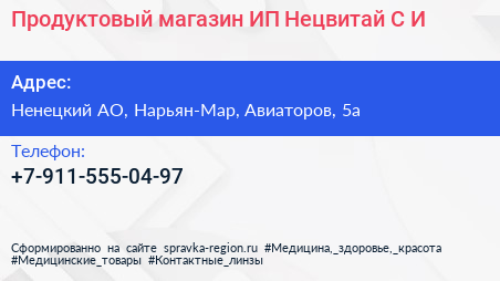 Продуктовый магазин, ИП Нецвитай С.И. по адресу Ненецкий АО, Нарьян-Мар, Авиаторов, 5а в дальнейшем Организация, размещена в следующих категориях: