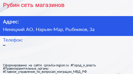 Рубин, сеть магазинов по адресу Ненецкий АО, Нарьян-Мар, Рыбников, 3а в дальнейшем Организация, размещена в следующих категориях: