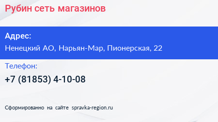 Рубин, сеть магазинов по адресу Ненецкий АО, Нарьян-Мар, Пионерская, 22 в дальнейшем Организация, размещена в следующих категориях: