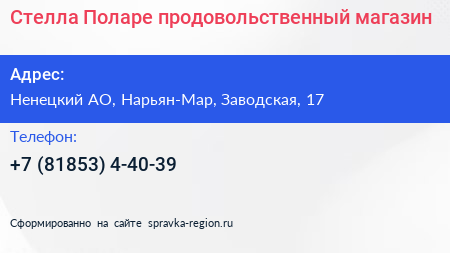 Стелла Поларе, продовольственный магазин по адресу Ненецкий АО, Нарьян-Мар, Заводская, 17 в дальнейшем Организация, размещена в следующих категориях: