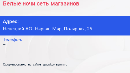 Белые ночи, сеть магазинов по адресу Ненецкий АО, Нарьян-Мар, Полярная, 25 в дальнейшем Организация, размещена в следующих категориях: