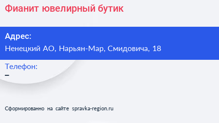 Фианит, ювелирный бутик по адресу Ненецкий АО, Нарьян-Мар, Смидовича, 18 в дальнейшем Организация, размещена в следующих категориях: