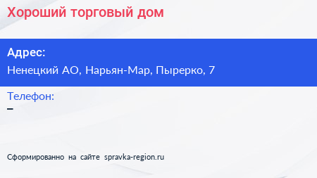 Хороший, торговый дом по адресу Ненецкий АО, Нарьян-Мар, Пырерко, 7 в дальнейшем Организация, размещена в следующих категориях: