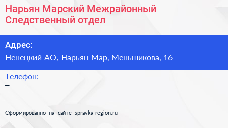 Нарьян-Марский Межрайонный Следственный отдел по адресу Ненецкий АО, Нарьян-Мар, Меньшикова, 16 в дальнейшем Организация, размещена в следующих категориях:
