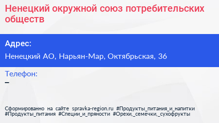 Ненецкий окружной союз потребительских обществ по адресу Ненецкий АО, Нарьян-Мар, Октябрьская, 36 в дальнейшем Организация, размещена в следующих категориях: