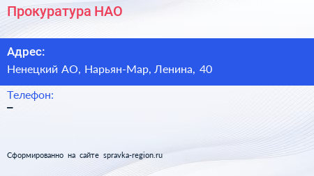 Прокуратура НАО по адресу Ненецкий АО, Нарьян-Мар, Ленина, 40 в дальнейшем Организация, размещена в следующих категориях: