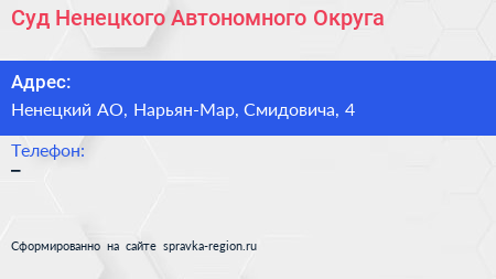 Суд Ненецкого Автономного Округа по адресу Ненецкий АО, Нарьян-Мар, Смидовича, 4 в дальнейшем Организация, размещена в следующих категориях: