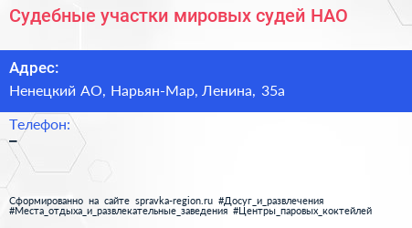 Судебные участки мировых судей НАО по адресу Ненецкий АО, Нарьян-Мар, Ленина, 35а в дальнейшем Организация, размещена в следующих категориях: