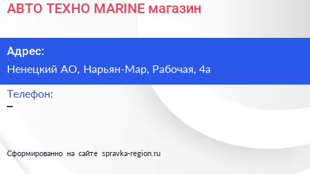 АВТО ТЕХНО MARINE, магазин по адресу Ненецкий АО, Нарьян-Мар, Рабочая, 4а в дальнейшем Организация, размещена в следующих категориях: