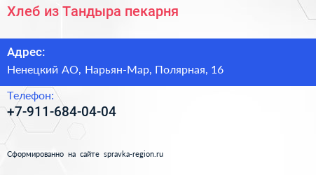 Хлеб из Тандыра, пекарня по адресу Ненецкий АО, Нарьян-Мар, Полярная, 16 в дальнейшем Организация, размещена в следующих категориях: