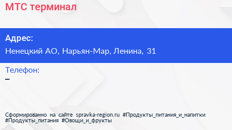 МТС, терминал по адресу Ненецкий АО, Нарьян-Мар, Ленина, 31 в дальнейшем Организация, размещена в следующих категориях: