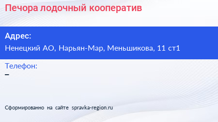 Печора, лодочный кооператив по адресу Ненецкий АО, Нарьян-Мар, Меньшикова, 11 ст1 в дальнейшем Организация, размещена в следующих категориях: