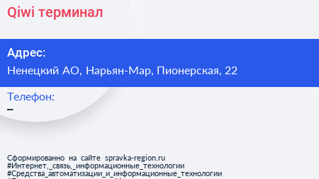 Qiwi, терминал по адресу Ненецкий АО, Нарьян-Мар, Пионерская, 22 в дальнейшем Организация, размещена в следующих категориях: