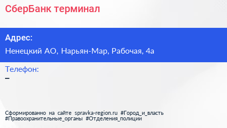 СберБанк, терминал по адресу Ненецкий АО, Нарьян-Мар, Рабочая, 4а в дальнейшем Организация, размещена в следующих категориях: