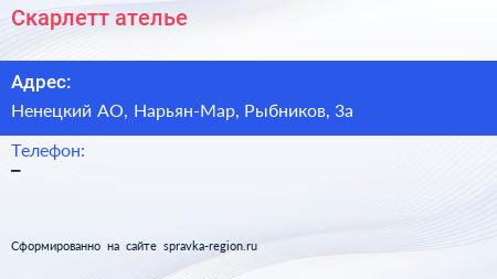 Скарлетт, ателье по адресу Ненецкий АО, Нарьян-Мар, Рыбников, 3а в дальнейшем Организация, размещена в следующих категориях: