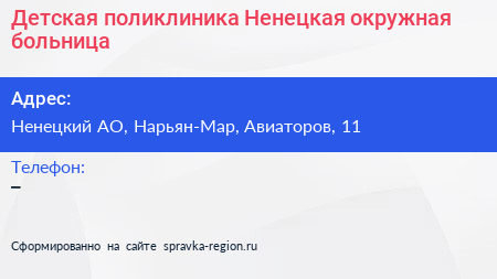 Детская поликлиника, Ненецкая окружная больница по адресу Ненецкий АО, Нарьян-Мар, Авиаторов, 11 в дальнейшем Организация, размещена в следующих категориях: