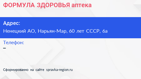 ФОРМУЛА ЗДОРОВЬЯ, аптека по адресу Ненецкий АО, Нарьян-Мар, 60 лет СССР, 6а в дальнейшем Организация, размещена в следующих категориях:
