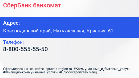 СберБанк, банкомат по адресу Краснодарский край, Натухаевская, Красная, 61 в дальнейшем Организация, размещена в следующих категориях: