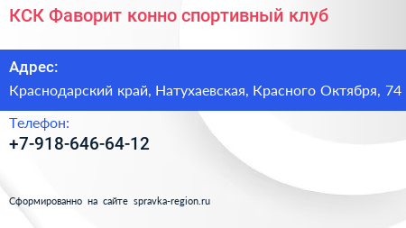 КСК Фаворит, конно-спортивный клуб по адресу Краснодарский край, Натухаевская, Красного Октября, 74 в дальнейшем Организация, размещена в следующих категориях: