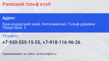 Раевский, гольф-клуб по адресу Краснодарский край, Натухаевская, Гольф-деревня Предгорье, 1 в дальнейшем Организация, размещена в следующих категориях: