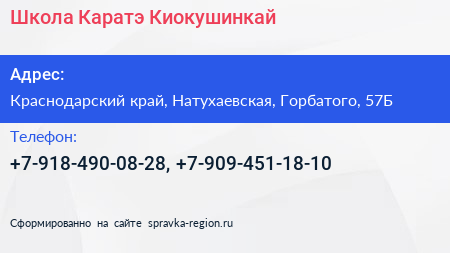 Школа Каратэ Киокушинкай по адресу Краснодарский край, Натухаевская, Горбатого, 57Б в дальнейшем Организация, размещена в следующих категориях: