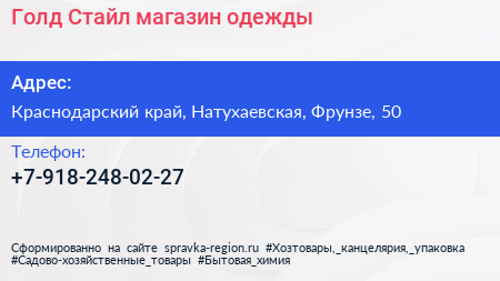 Голд Стайл, магазин одежды по адресу Краснодарский край, Натухаевская, Фрунзе, 50 в дальнейшем Организация, размещена в следующих категориях: