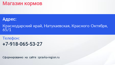 Магазин кормов по адресу Краснодарский край, Натухаевская, Красного Октября, 65/1 в дальнейшем Организация, размещена в следующих категориях: