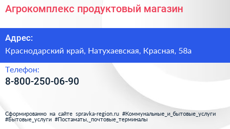 Агрокомплекс, продуктовый магазин по адресу Краснодарский край, Натухаевская, Красная, 58а в дальнейшем Организация, размещена в следующих категориях: