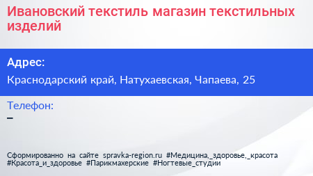 Ивановский текстиль, магазин текстильных изделий по адресу Краснодарский край, Натухаевская, Чапаева, 25 в дальнейшем Организация, размещена в следующих категориях: