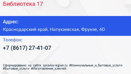 Библиотека №17 по адресу Краснодарский край, Натухаевская, Фрунзе, 60 в дальнейшем Организация, размещена в следующих категориях:
