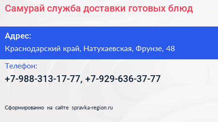 Самурай, служба доставки готовых блюд по адресу Краснодарский край, Натухаевская, Фрунзе, 48 в дальнейшем Организация, размещена в следующих категориях: