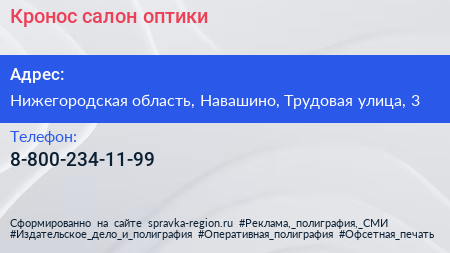 Кронос, салон оптики по адресу Нижегородская область, Навашино, Трудовая улица, 3 в дальнейшем Организация, размещена в следующих категориях: