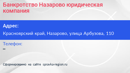 Банкротство Назарово, юридическая компания по адресу Красноярский край, Назарово, улица Арбузова, 110 в дальнейшем Организация, размещена в следующих категориях: