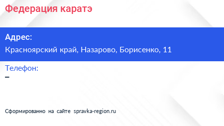 Федерация каратэ по адресу Красноярский край, Назарово, Борисенко, 11 в дальнейшем Организация, размещена в следующих категориях: