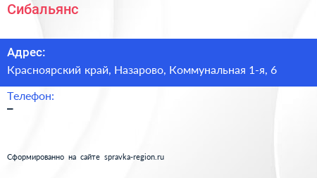 Сибальянс по адресу Красноярский край, Назарово, Коммунальная 1-я, 6 в дальнейшем Организация, размещена в следующих категориях: