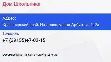 Дом Школьника по адресу Красноярский край, Назарово, улица Арбузова, 112а в дальнейшем Организация, размещена в следующих категориях: