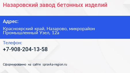 Назаровский завод бетонных изделий по адресу Красноярский край, Назарово, микрорайон Промышленный Узел, 12а в дальнейшем Организация, размещена в следующих категориях: