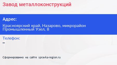 Завод металлоконструкций по адресу Красноярский край, Назарово, микрорайон Промышленный Узел, 8 в дальнейшем Организация, размещена в следующих категориях: