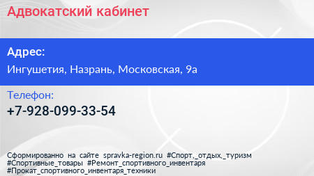 Адвокатский кабинет по адресу Ингушетия, Назрань, Московская, 9а в дальнейшем Организация, размещена в следующих категориях: