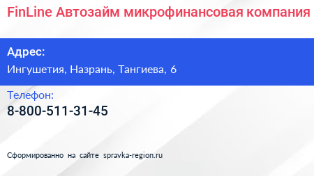 FinLine-Автозайм, микрофинансовая компания по адресу Ингушетия, Назрань, Тангиева, 6 в дальнейшем Организация, размещена в следующих категориях: